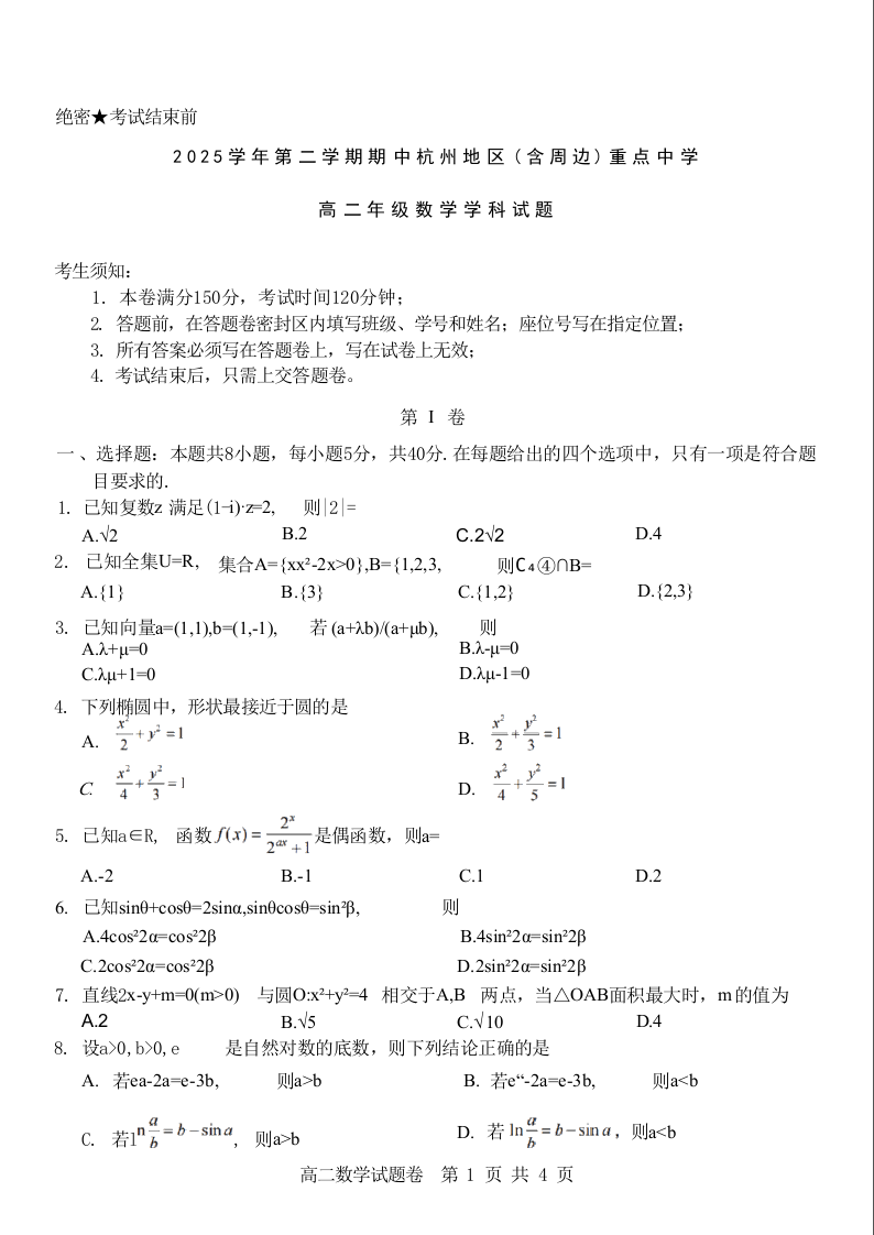 高二数学--浙江省杭州地区(含周边)重点中学2025-2026学年高二第二学期期中联考