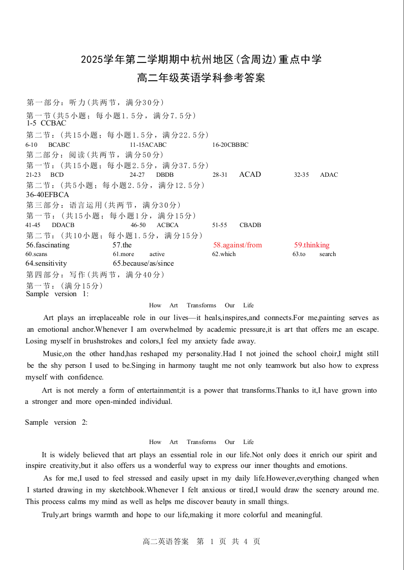 高二英语答案--浙江省杭州地区(含周边)重点中学2025-2026学年高二第二学期期中联考