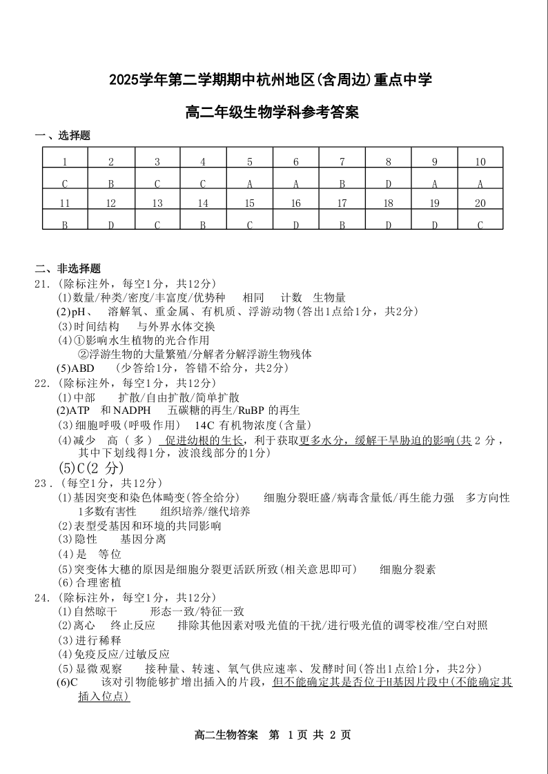 高二生物答案--浙江省杭州地区(含周边)重点中学2025-2026学年高二第二学期期中联考
