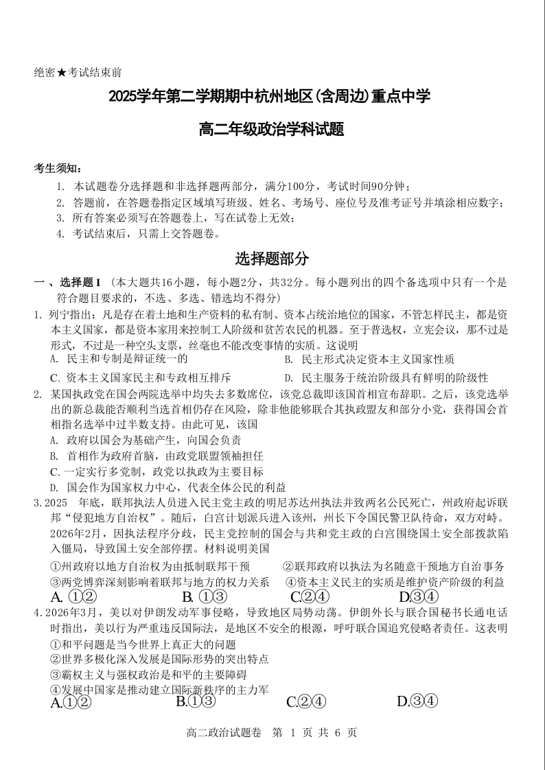 高二政治--浙江省杭州地区(含周边)重点中学2025-2026学年高二第二学期期中联考