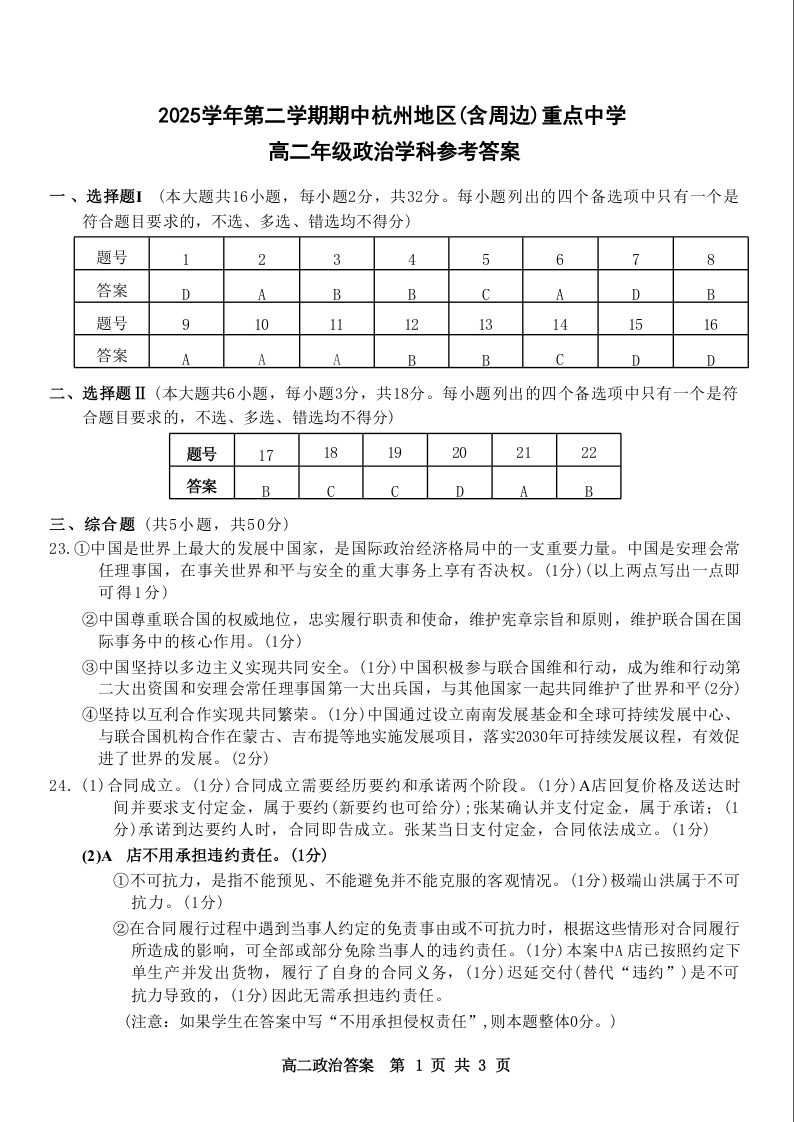 高二政治答案--浙江省杭州地区(含周边)重点中学2025-2026学年高二第二学期期中联考