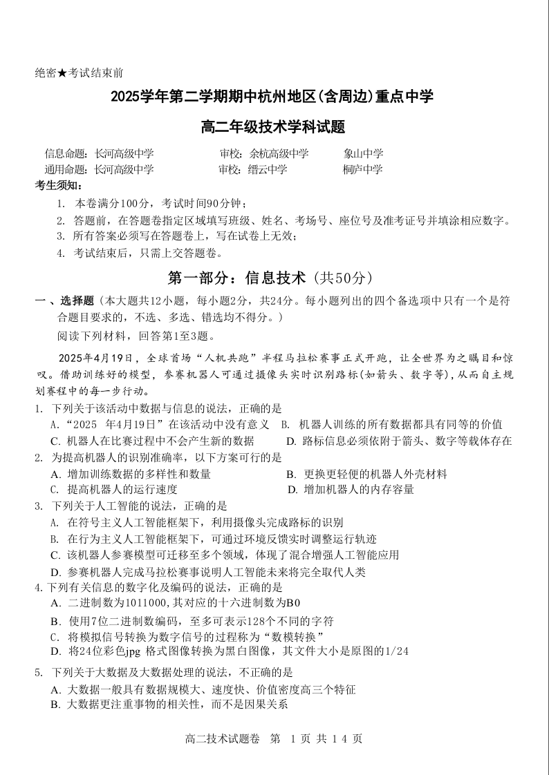 高二技术--浙江省杭州地区(含周边)重点中学2025-2026学年高二第二学期期中联考