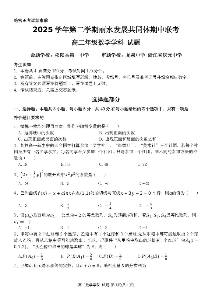 高二数学+答案----浙江省丽水市发展共同体2025-2026学年高二下学期期中联考