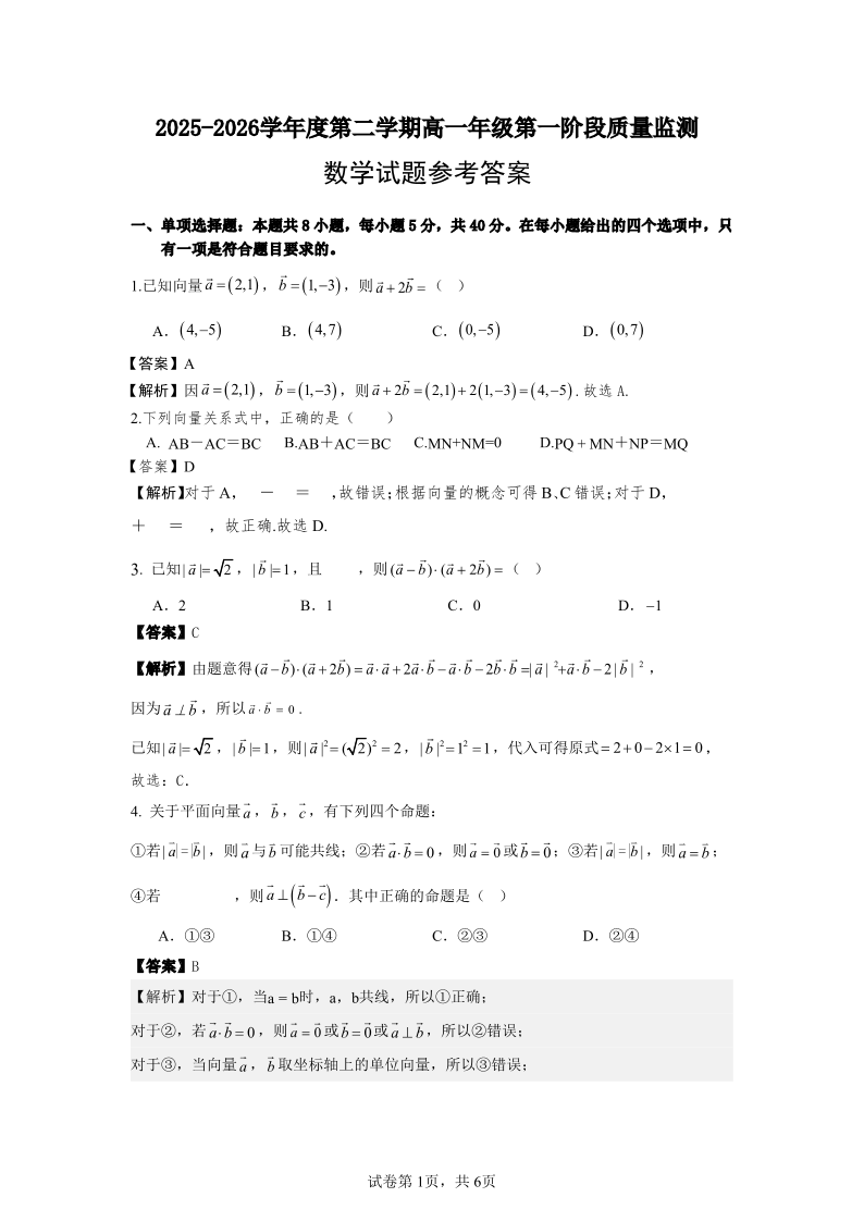 高一数学答案--广东省深圳市聚龙科学中学2025-2026学年高一下学期第一阶段质量监测联考