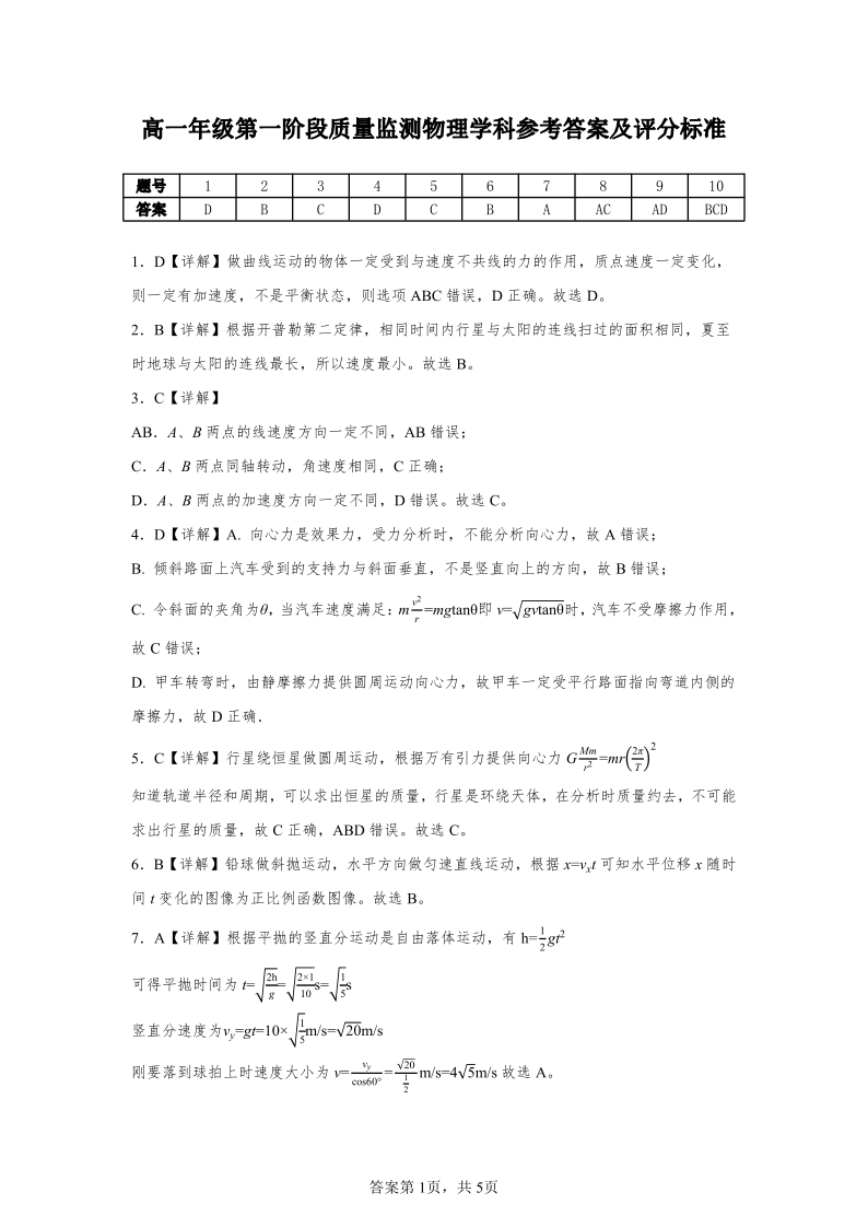 高一物理答案--广东省深圳市聚龙科学中学2025-2026学年高一下学期第一阶段质量监测联考