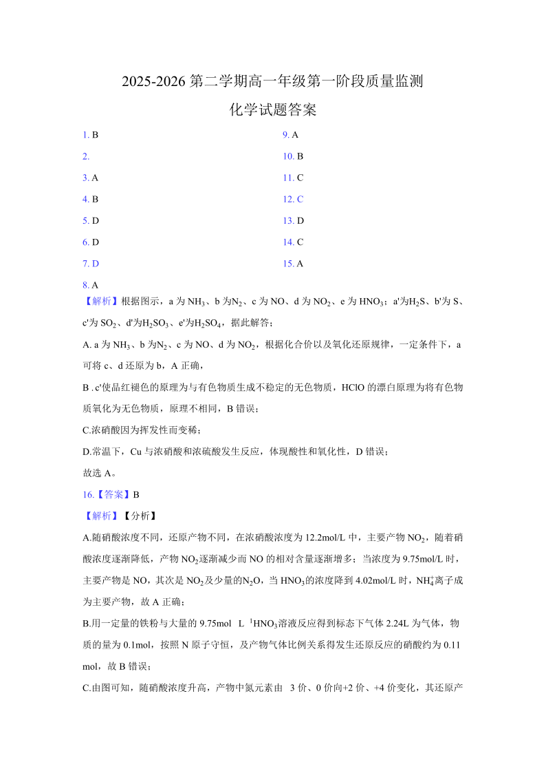 高一化学答案--广东省深圳市聚龙科学中学2025-2026学年高一下学期第一阶段质量监测联考
