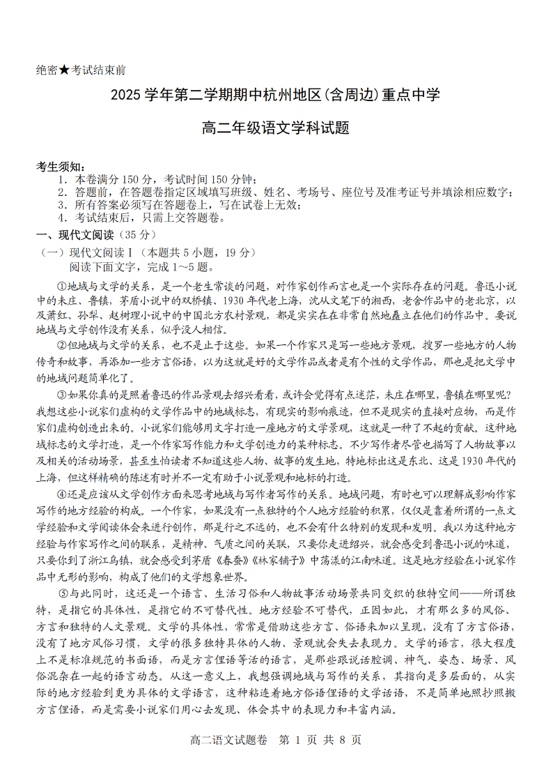 高一语文+答案--浙江省杭州地区(含周边)重点中学2025-2026学年高一第二学期期中联考