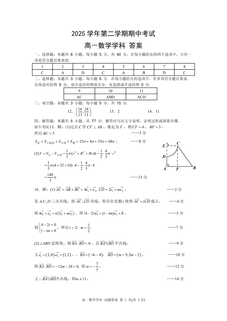 高一数学答案--浙江省衢州五校联考2025-2026学年高一下学期期中考考试