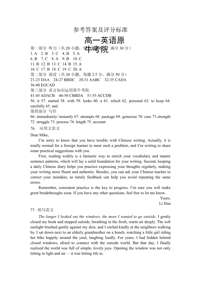 高一英语答案--浙江省衢州五校联考2025-2026学年高一下学期期中考考试