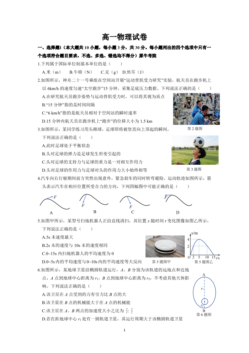 高一物理--浙江省衢州五校联考2025-2026学年高一下学期期中考考试