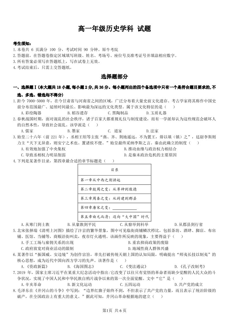 高一历史--浙江省衢州五校联考2025-2026学年高一下学期期中考考试
