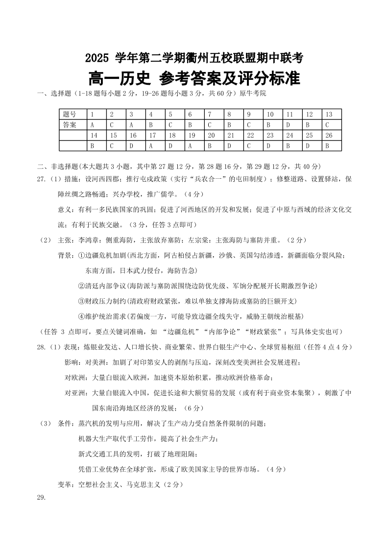 高一历史答案--浙江省衢州五校联考2025-2026学年高一下学期期中考考试
