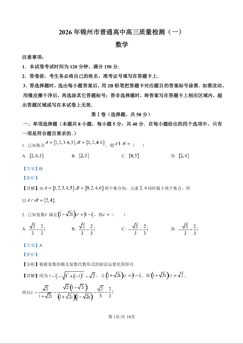 高三数学(精品解析版)--辽宁省锦州市2026届高三下学期质量检测(一)