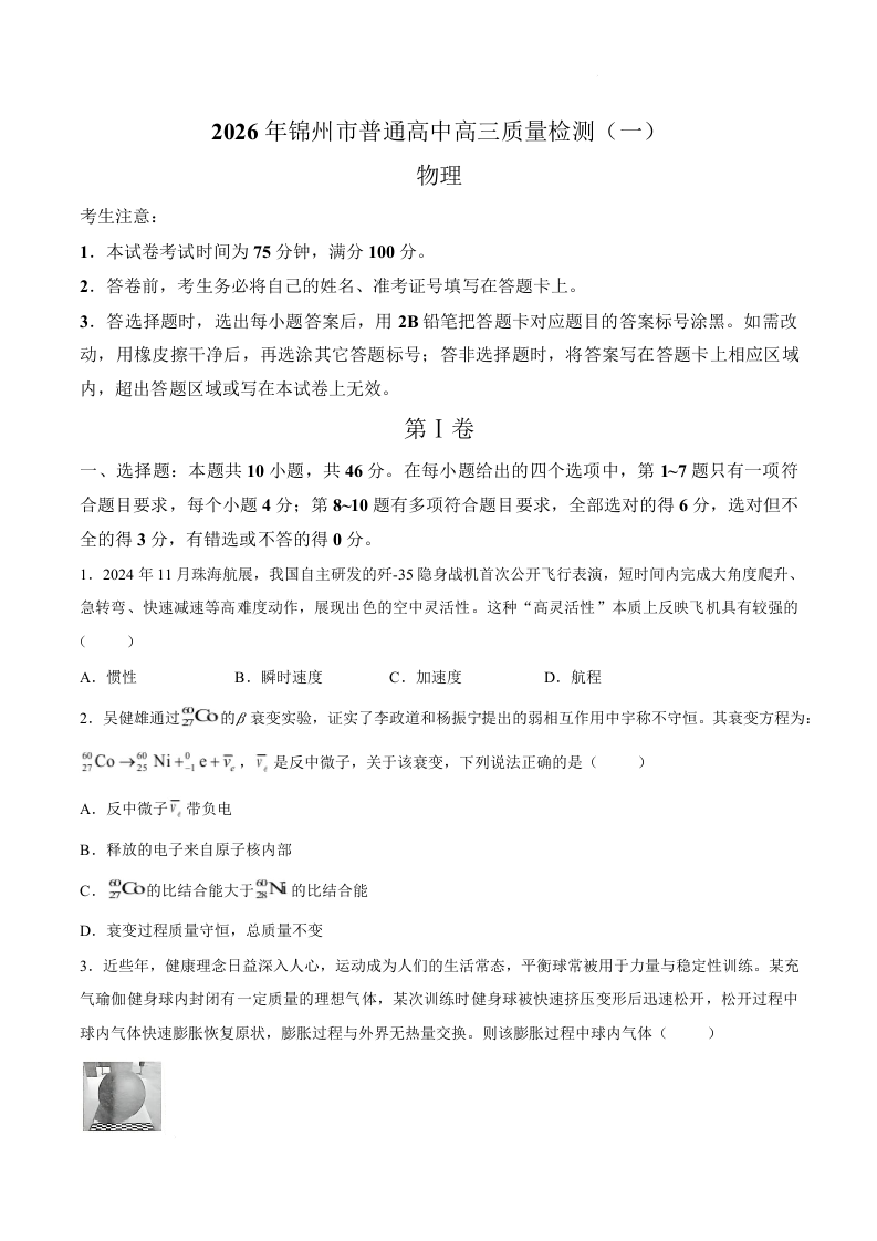 高三物理--辽宁省锦州市2026届高三下学期质量检测(一)