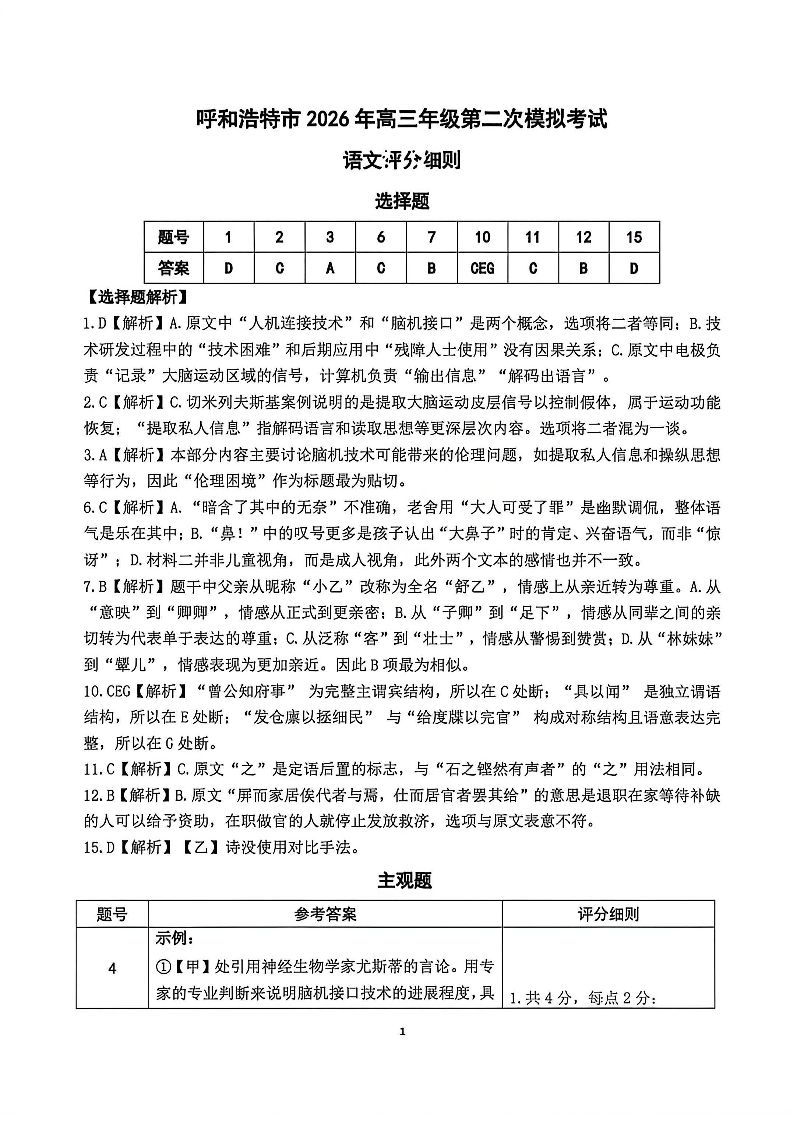 高三语文答案--内蒙古呼和浩特市 2026 届高三年级第二次质量数据监测(呼和浩特二模)