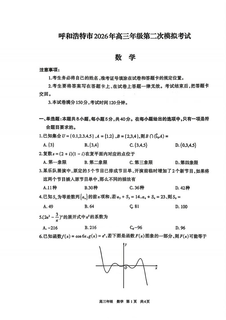 高三数学--内蒙古呼和浩特市 2026 届高三年级第二次质量数据监测(呼和浩特二模)
