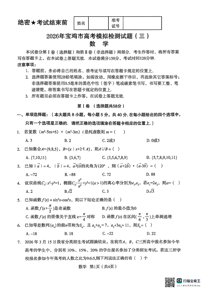高三数学--陕西省宝鸡市2026届高三下学期模拟检测(三)(宝鸡三模)