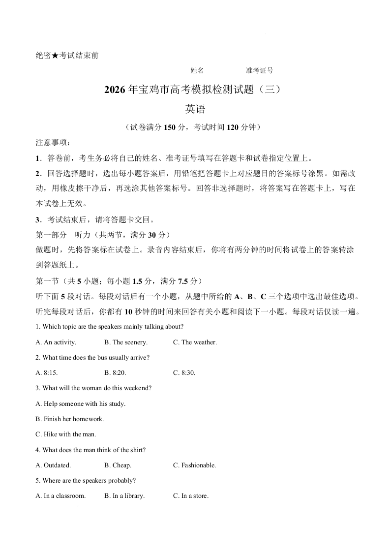 高三英语--陕西省宝鸡市2026届高三下学期模拟检测(三)(宝鸡三模)