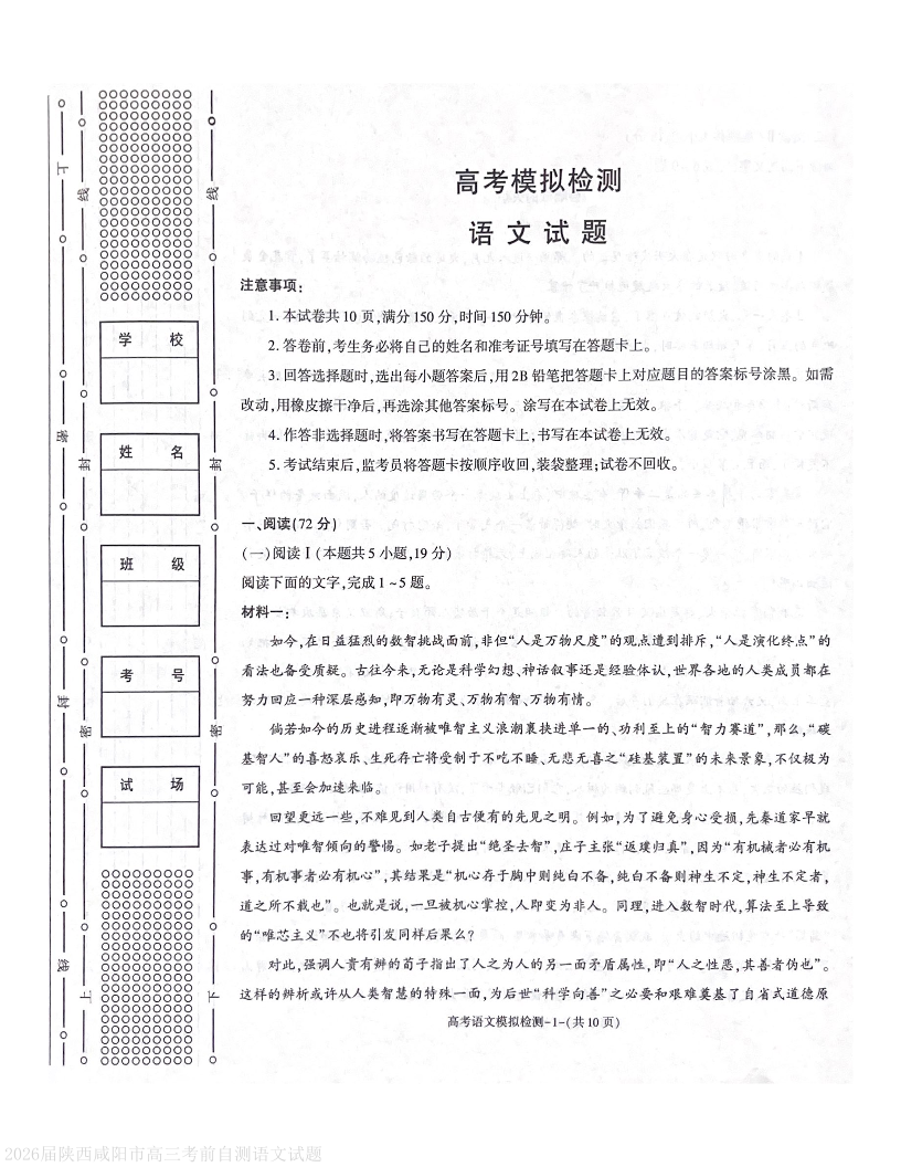 高三语文--陕西省咸阳市2026届高三下学期模拟检测(三)(咸阳三模)