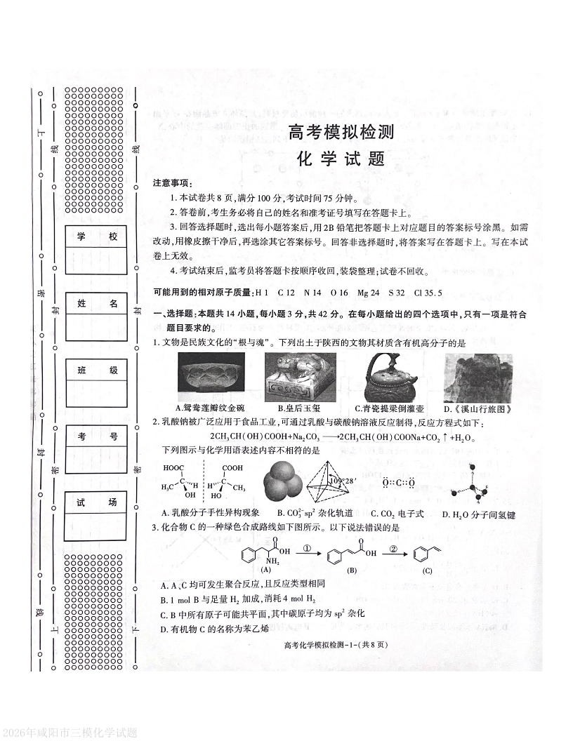 高三化学--陕西省咸阳市2026届高三下学期模拟检测(三)(咸阳三模)