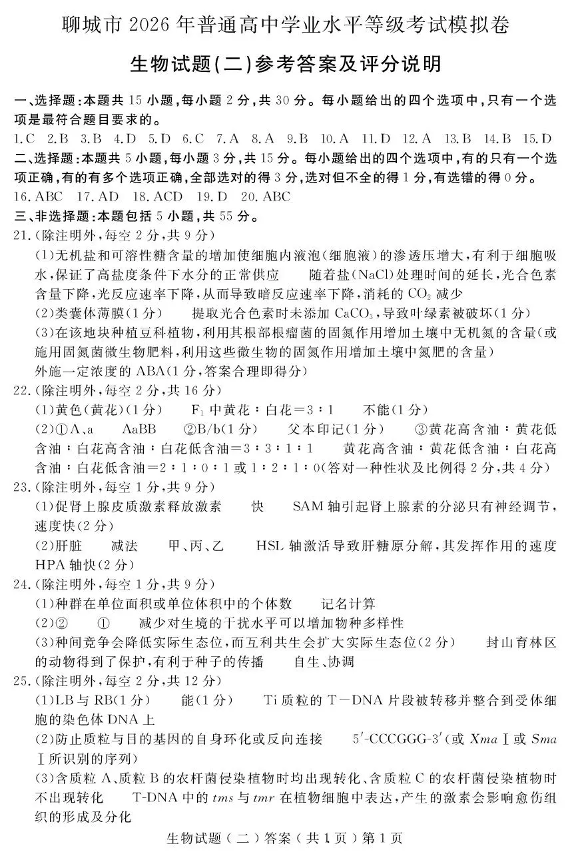 高三生物答案--聊城市2026年普通高中学业水平等级考试模拟卷