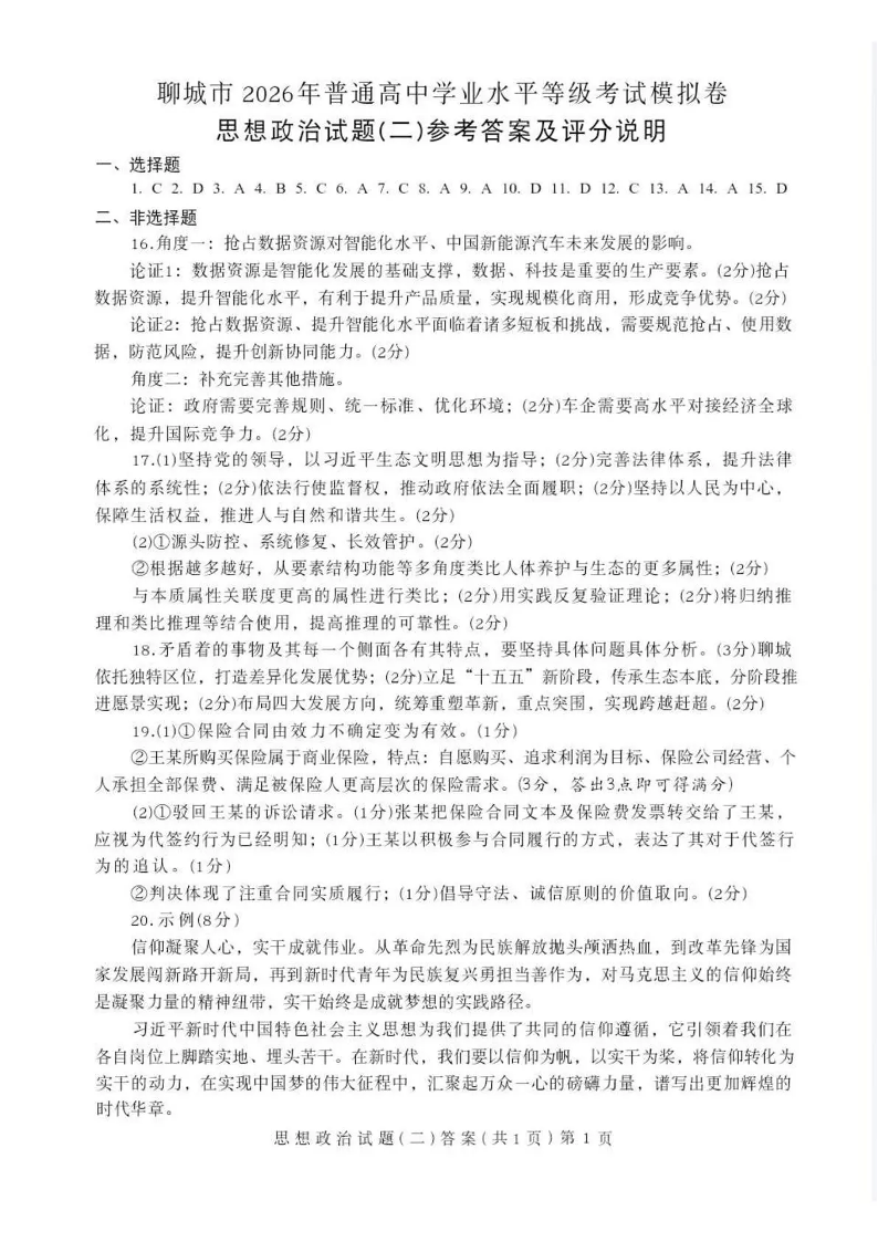 高三政治答案--聊城市2026年普通高中学业水平等级考试模拟卷