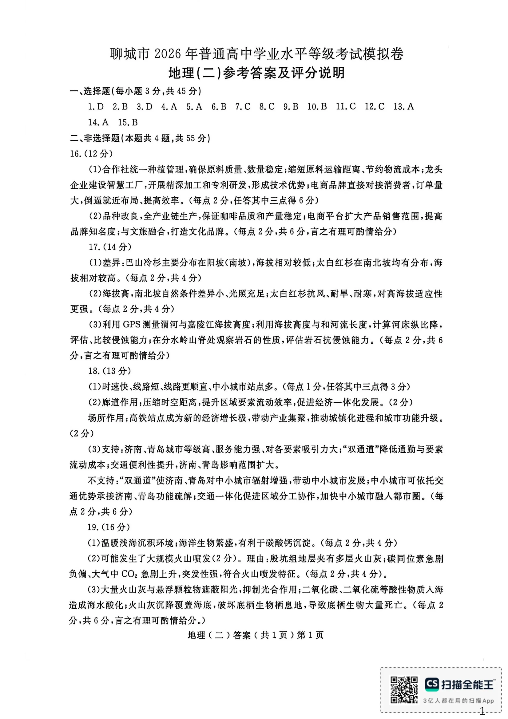 高三地理答案--聊城市2026年普通高中学业水平等级考试模拟卷