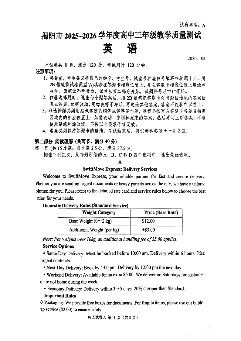 高三英语--广东省省揭阳市2026届高三4月教学质量测试(揭阳二模)