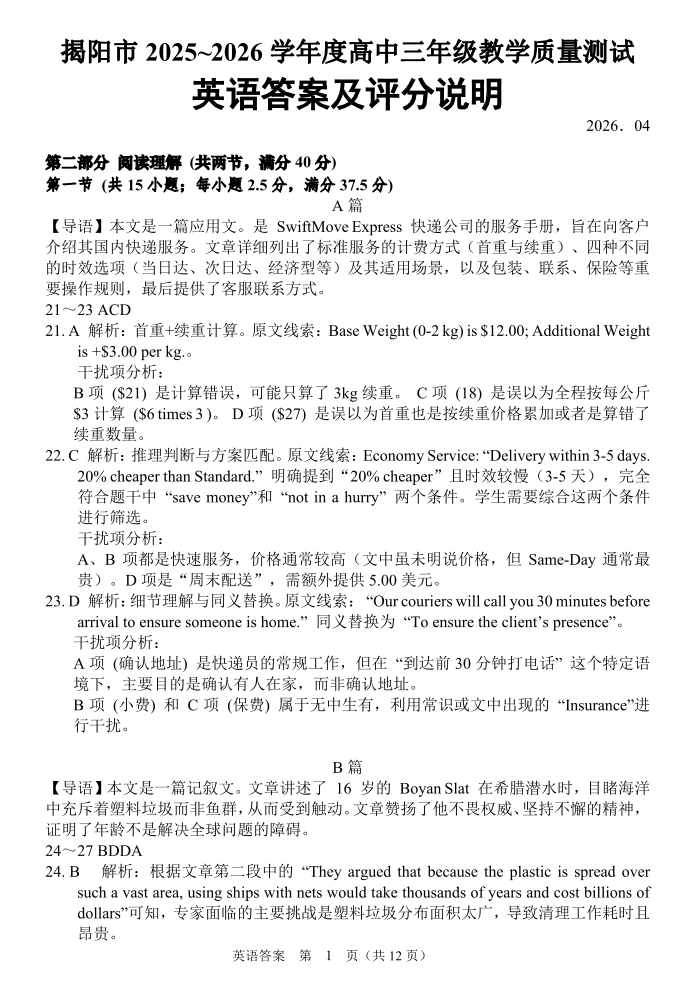 高三英语答案--广东省省揭阳市2026届高三4月教学质量测试(揭阳二模)