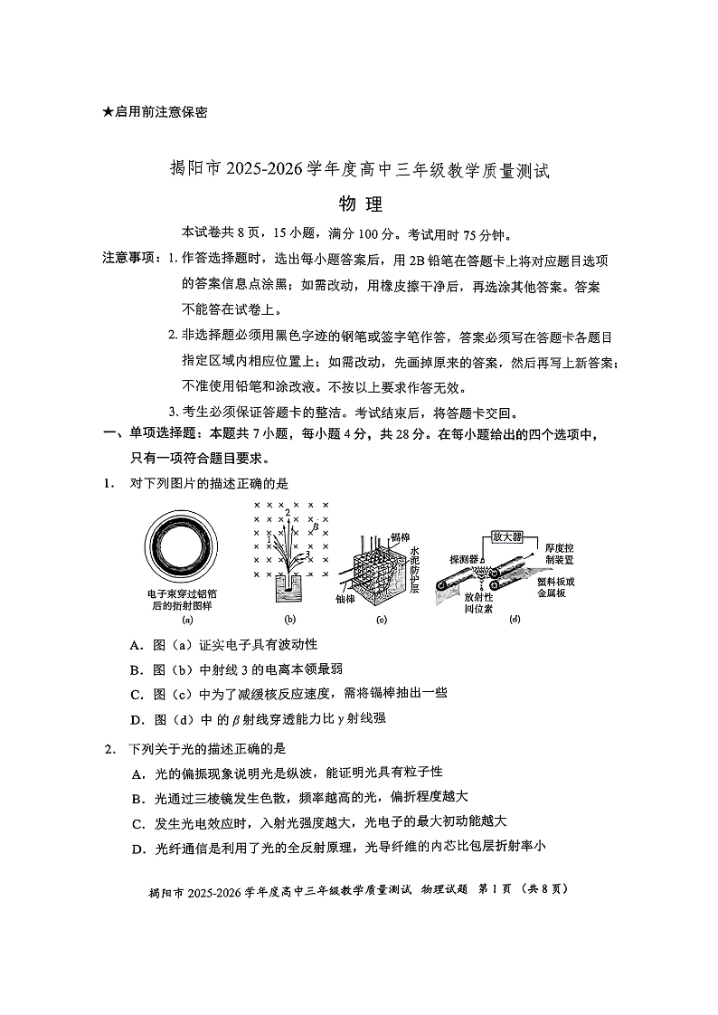 高三物理--广东省省揭阳市2026届高三4月教学质量测试(揭阳二模)