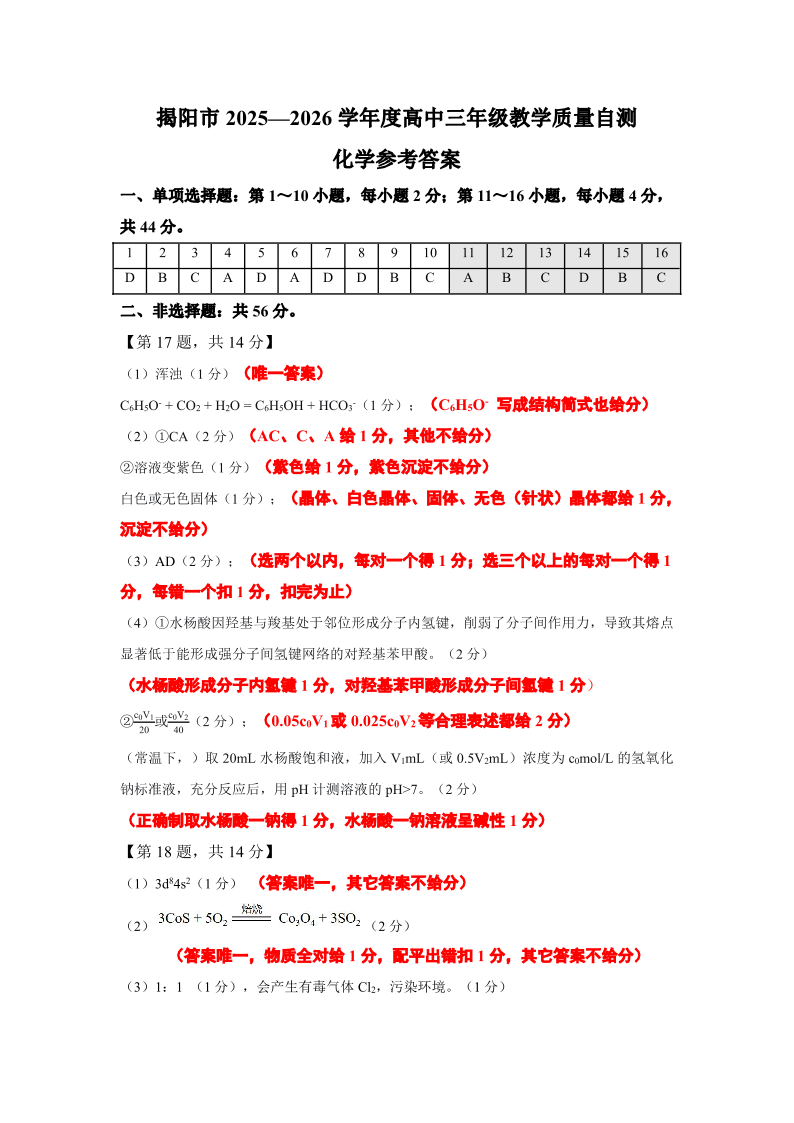 高三化学答案--广东省省揭阳市2026届高三4月教学质量测试(揭阳二模)
