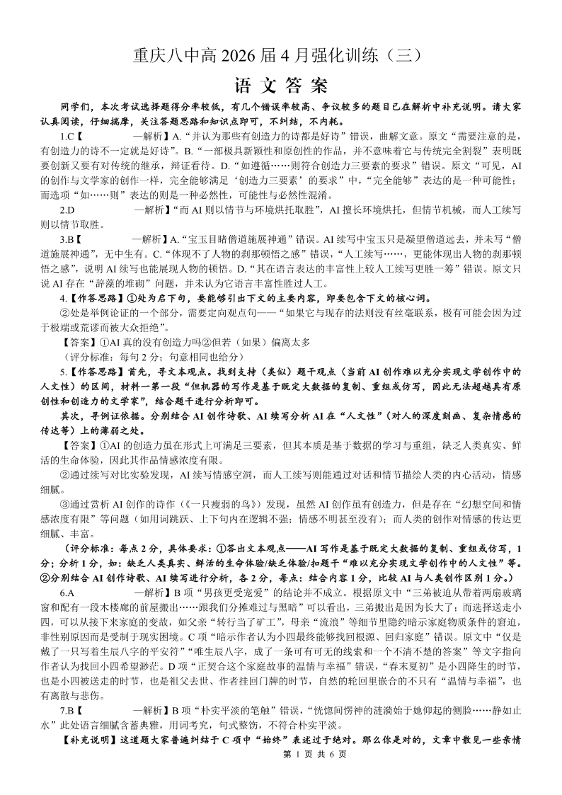 高三语文答案--重庆市第八中高2026届高三4月强化训练(三)