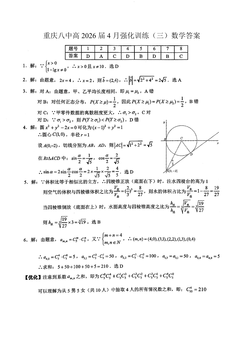 高三数学答案--重庆市第八中高2026届高三4月强化训练(三)