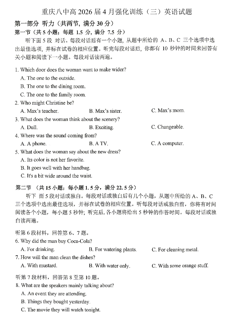 高三英语--重庆市第八中高2026届高三4月强化训练(三)