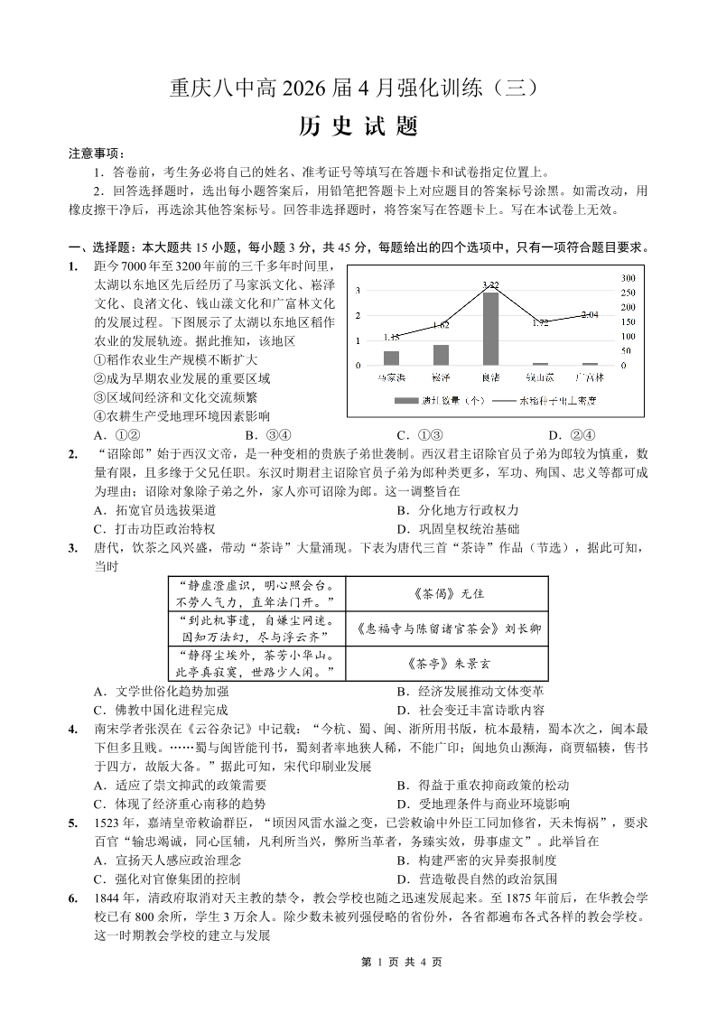 高三历史--重庆市第八中高2026届高三4月强化训练(三)