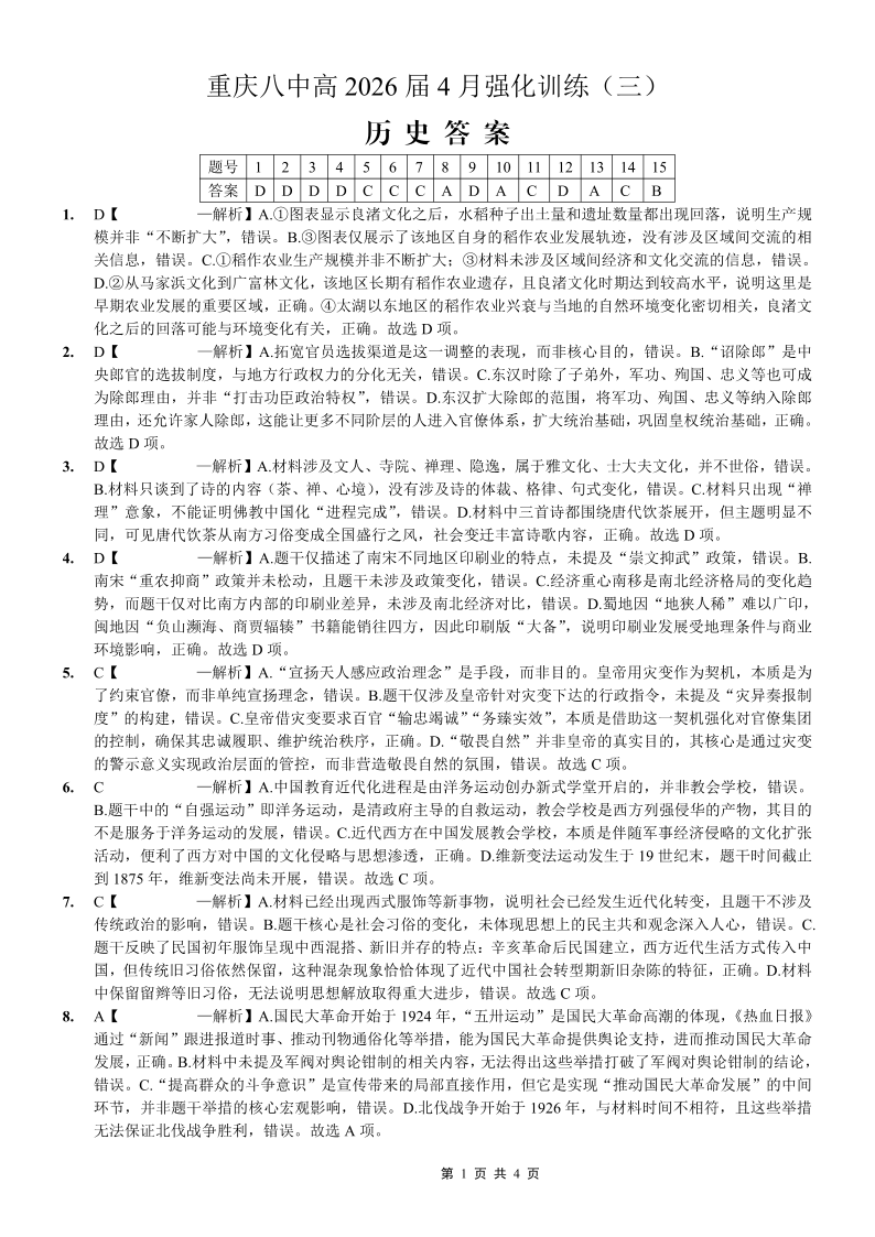 高三历史答案--重庆市第八中高2026届高三4月强化训练(三)