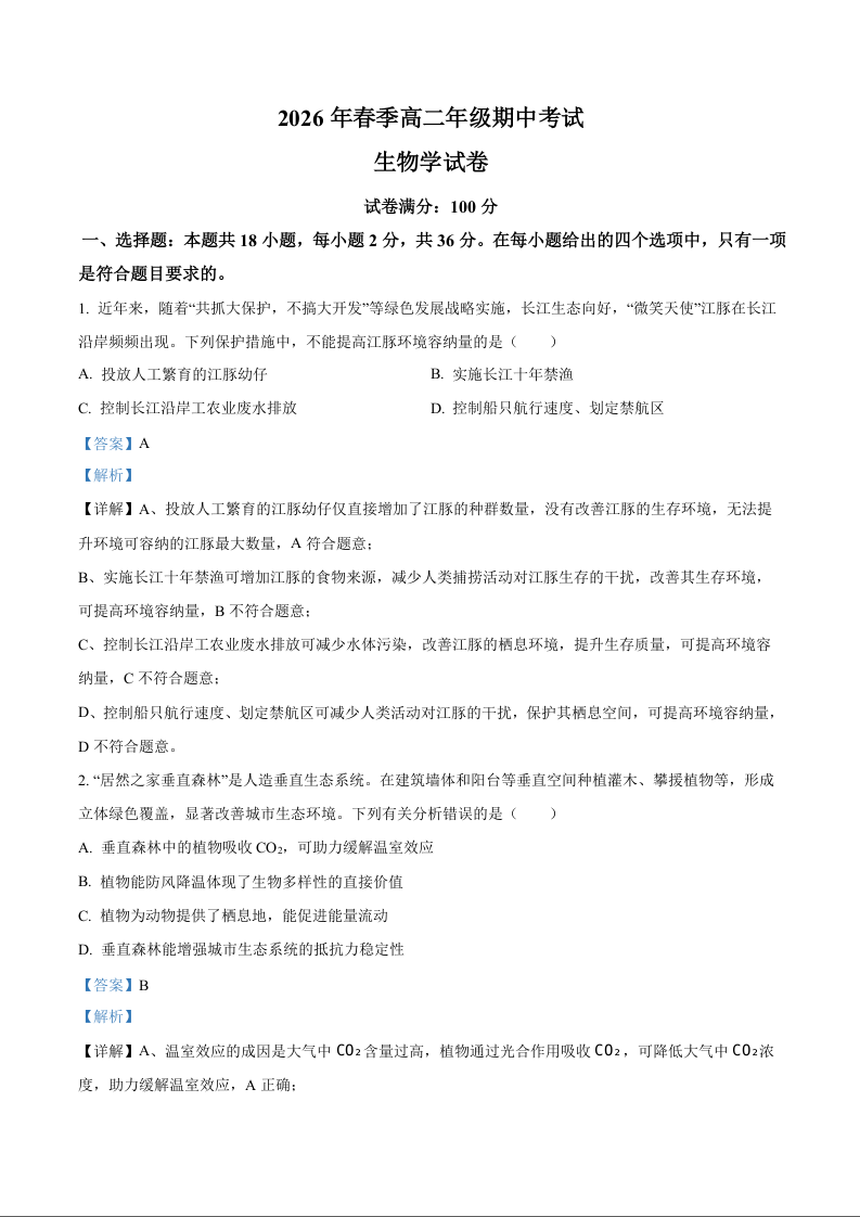 高二生物学(解析版)--湖北省鄂东南联盟2025-2026学年高二下学期期中联考