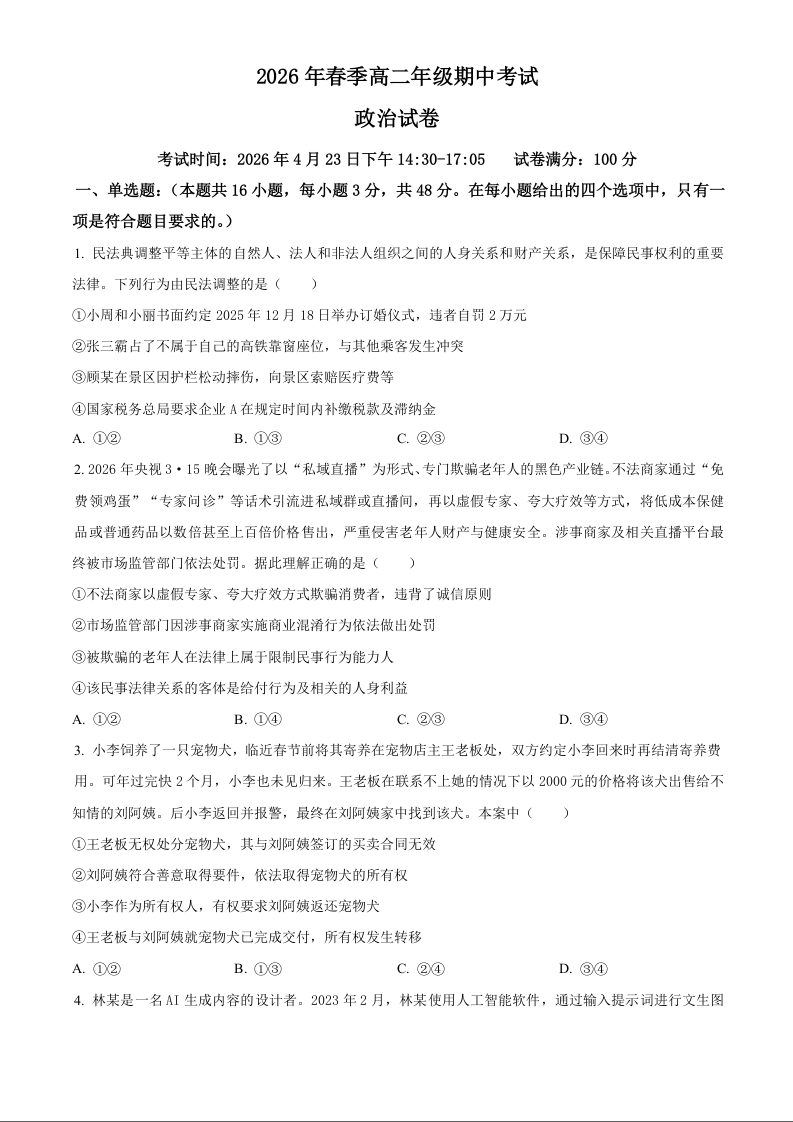 高二政治(原卷版)--湖北省鄂东南联盟2025-2026学年高二下学期期中联考