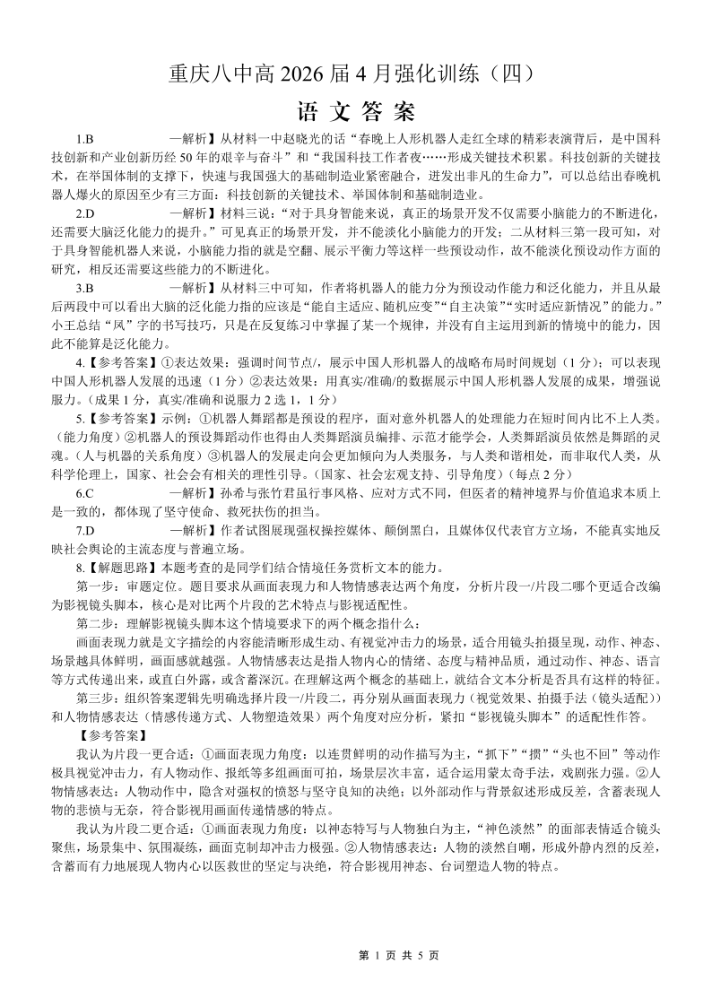 高三语文答案--重庆市第八中高2026届高三4月强化训练(四)