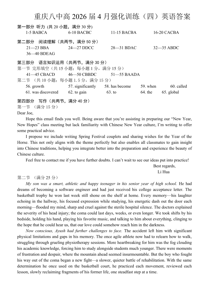 高三英语答案--重庆市第八中高2026届高三4月强化训练(四)
