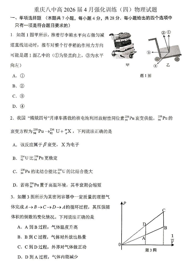 高三物理--重庆市第八中高2026届高三4月强化训练(四)