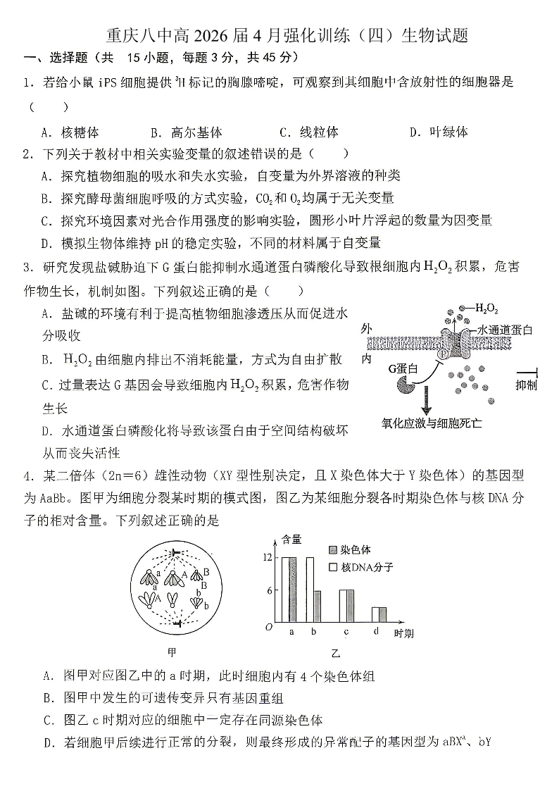 高三生物--重庆市第八中高2026届高三4月强化训练(四)