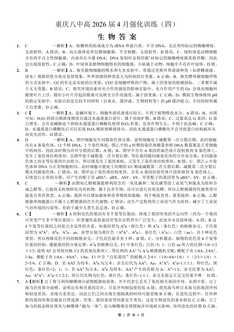 高三生物答案--重庆市第八中高2026届高三4月强化训练(四)