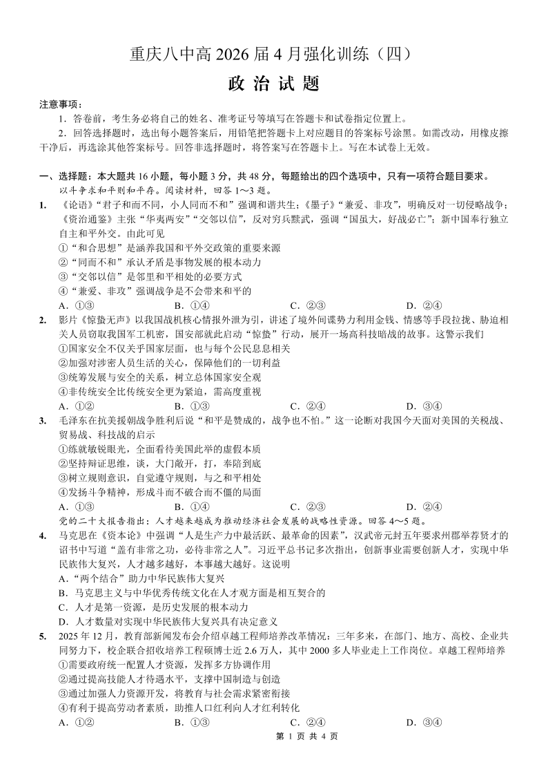 高三政治--重庆市第八中高2026届高三4月强化训练(四)