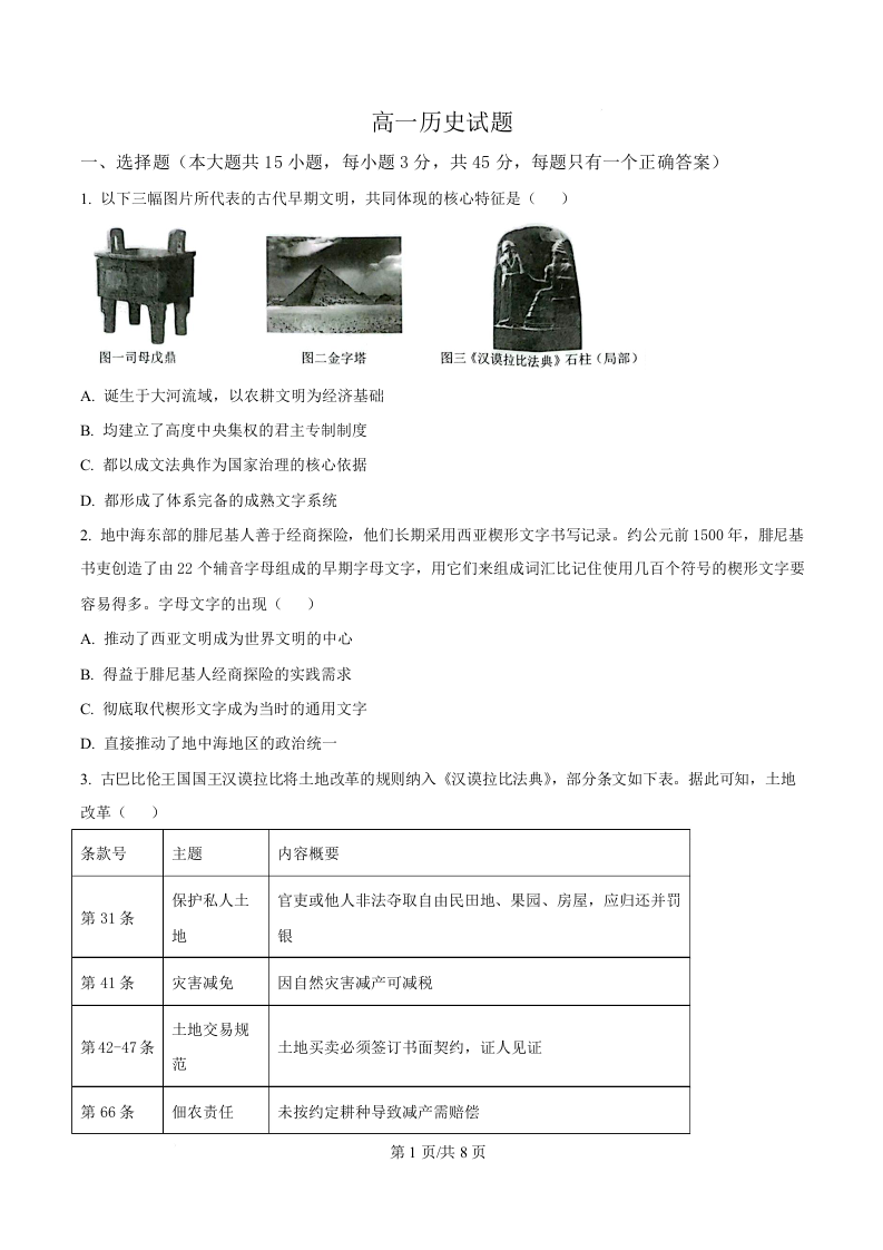 高一历史(原卷版)--湖北省鄂北六校2025-2026学年高一下学期期中联考