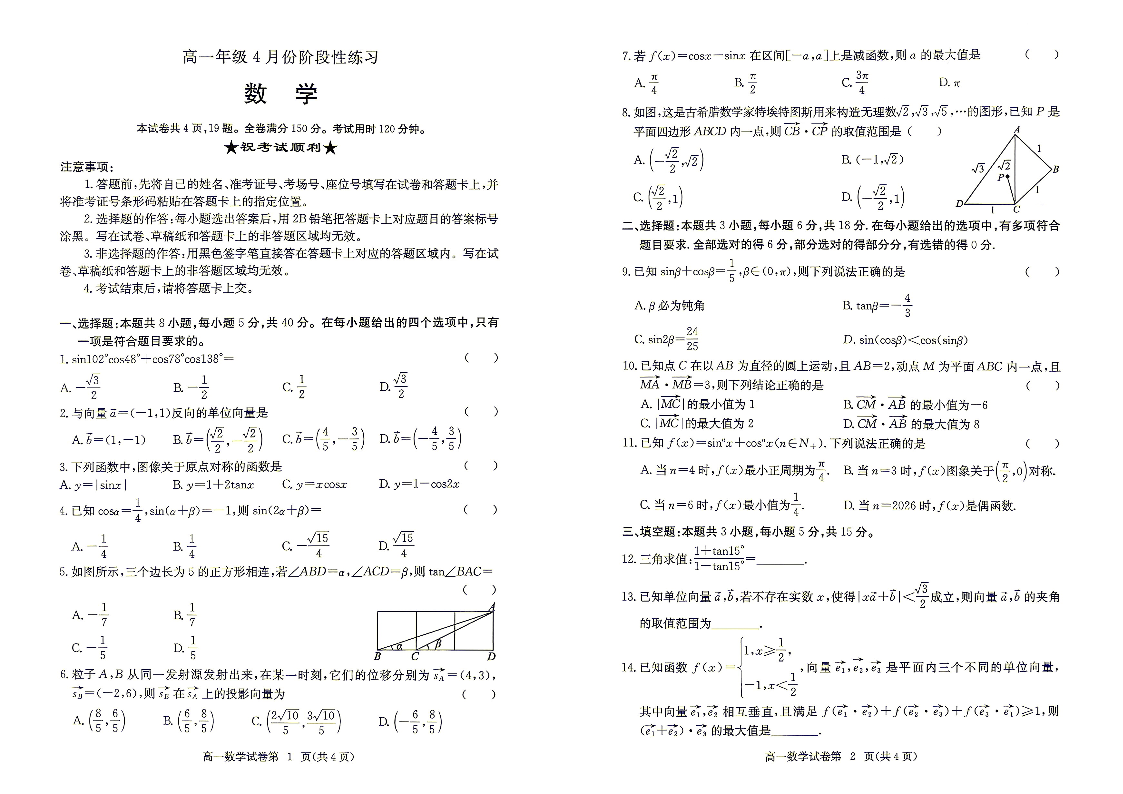 高一数学--湖北省黄冈市2025-2026学年高一下学期期中考试
