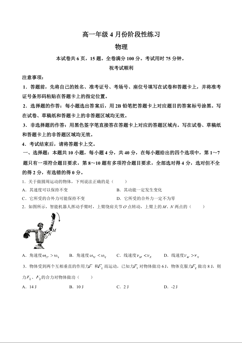 高一物理--湖北省黄冈市2025-2026学年高一下学期期中考试
