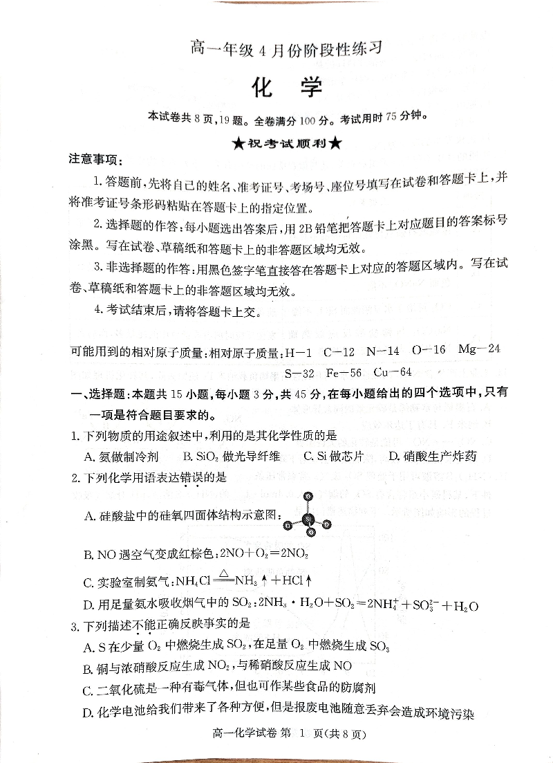 高一化学--湖北省黄冈市2025-2026学年高一下学期期中考试