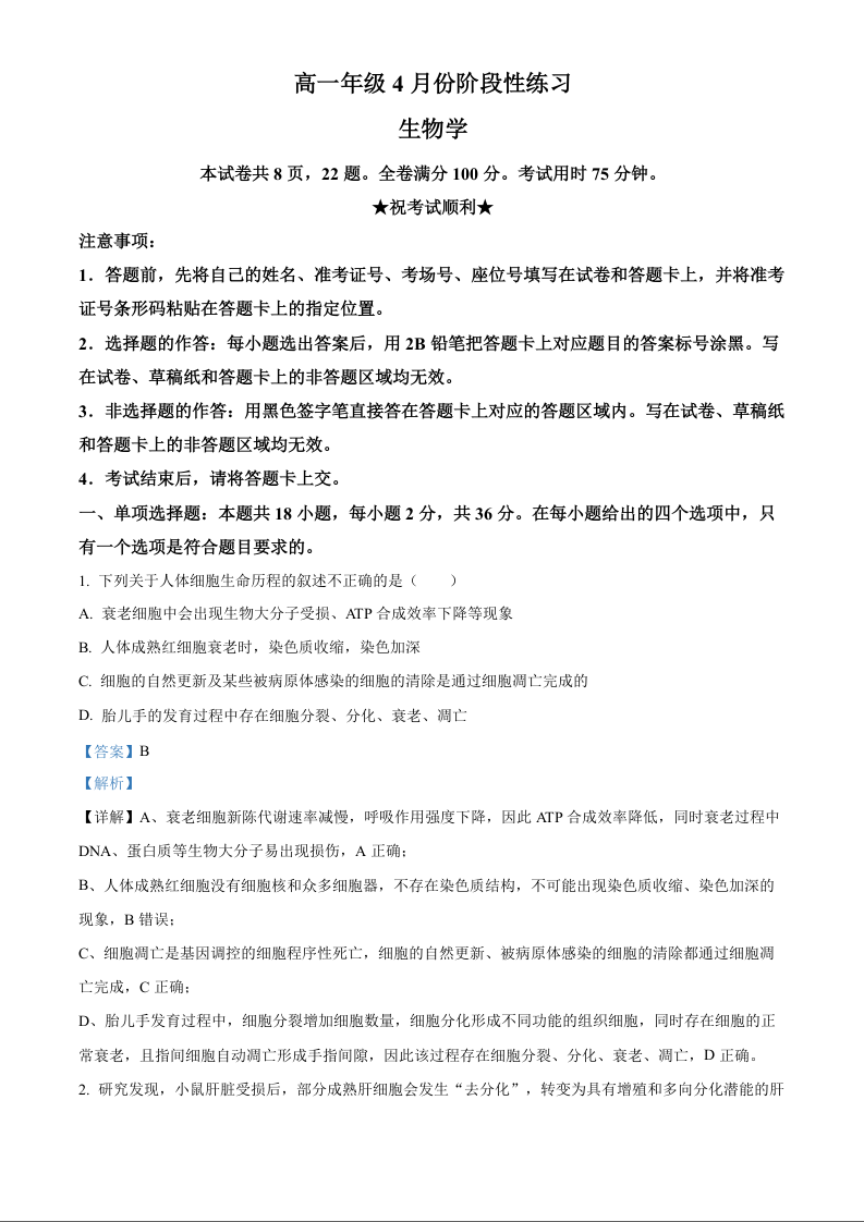 高一生物学(解析版)--湖北省黄冈市2025-2026学年高一下学期期中考试