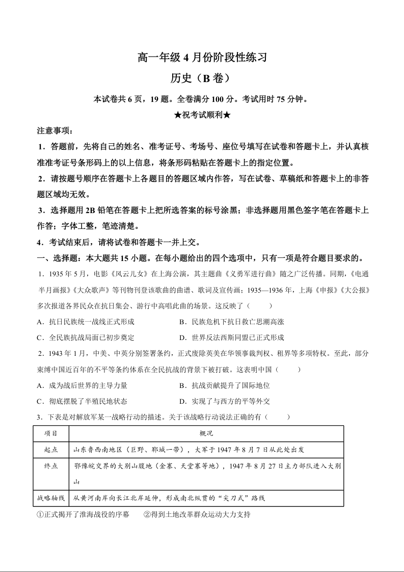 高一历史--湖北省黄冈市2025-2026学年高一下学期期中考试